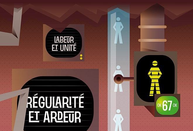 Treize heures, Marc, les yeux mis-clos, toucha de ses paumes celles d’Olivier. “Régularité et ardeur”, murmura-t-il. “Repos du travailleur”, lui répondit-il. Marc partit, Olivier s’assit au poste de travail et commença à travailler. Tandis que la sonde nutritionnelle se plantait dans son bras, lui apportant sa ration calorique du déjeuner, il commença ses tâches du jour. Un bruit de ressac marin berçait l’open space.