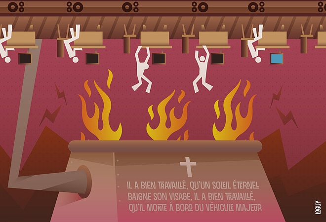 Kevin prit le calice empoisonné que lui tendait le prêtre d’entreprise (PE) et monta à bord du bateau, où il s’allongea. “Il a bien travaillé, qu’un soleil éternel baigne son visage, il a bien travaillé, qu’il monte à bord du Véhicule majeur…” Le silence retomba sur un signe du PE qui prononça alors la phrase clôturant le rituel :