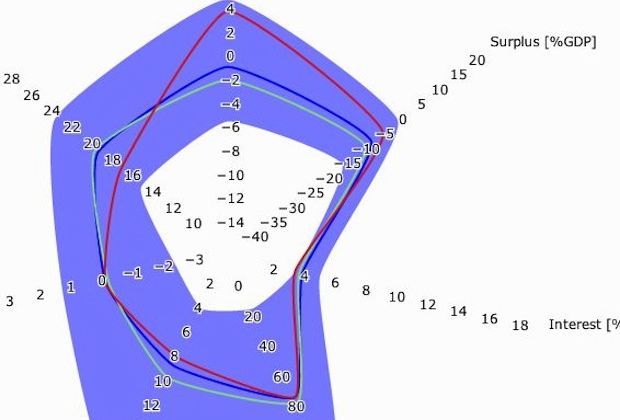 Les évolutions entre 2006 et 2011 sont particulièrement visibles grâce à la présence de ces deux variables : la zone se déplace vers le bas au fur et à mesure des années (notamment pour l’indicateur dette) et elle est également plus étendue, montrant que les inégalités au sein de la zone euro se sont aggravées.