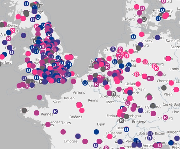 Première étape : entrer sa ville, son pays, et ce que nous inspire nos perspectives professionnelles dans les deux ans à venir (très optimiste, relativement optimiste, neutre, relativement pessimiste, très pessimiste). Deuxième étape : la consultation de la carte d’Europe où à chaque réponse a été associée un point, coloré selon le choix effectué. Bien que le nombre de participations soit très supérieur au Royaume-Uni, il se dessine néanmoins des tendances, avec plus d’optimisme dans le nord de l’Europe que dans le sud (Espagne, Italie, Grèce).